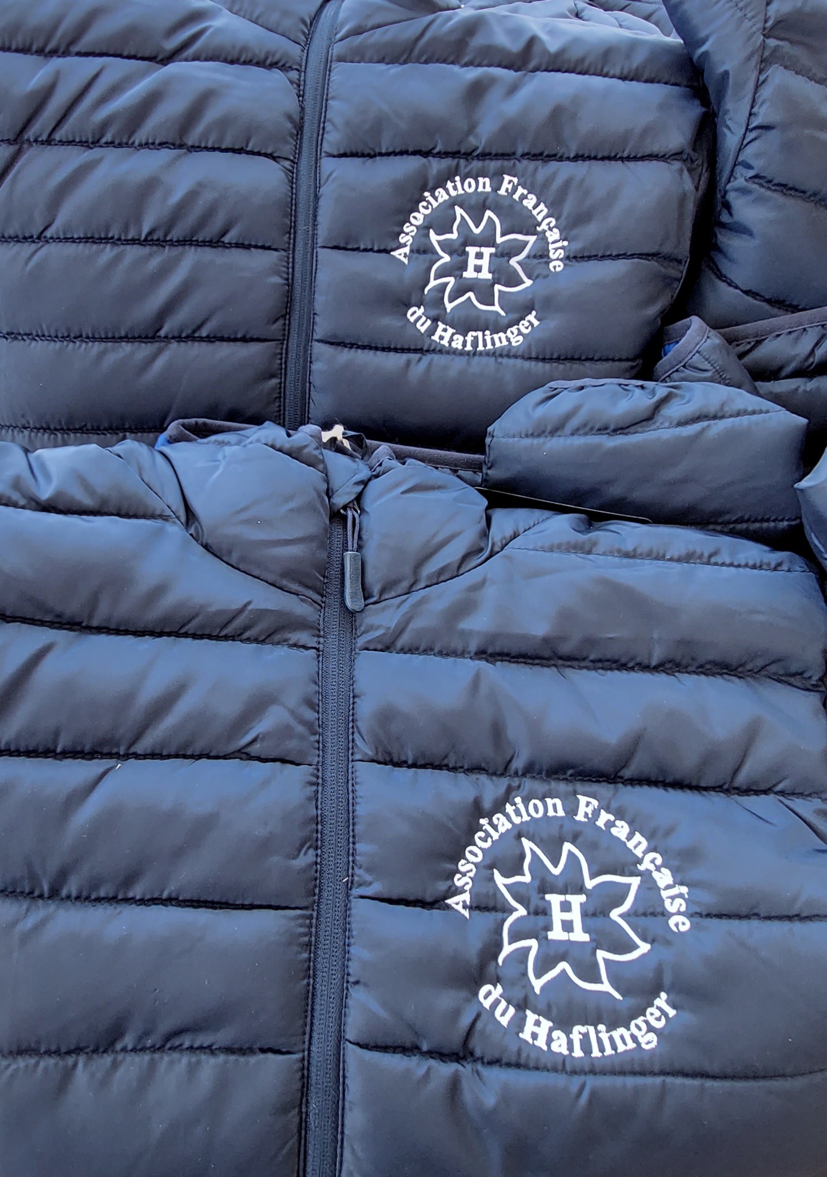 La doudoune à capuche, logo AFH devant, inscription HAFLINGER FRANCE au dos. Broderie. Mixte, taille S à XXL. Taille grand.